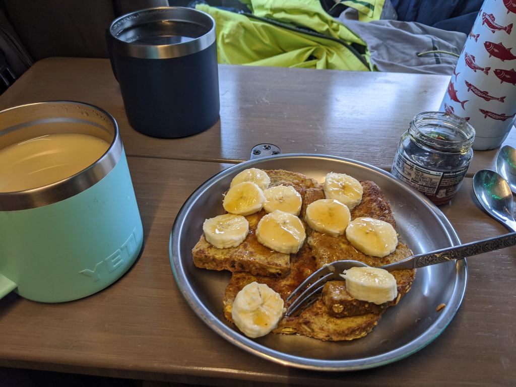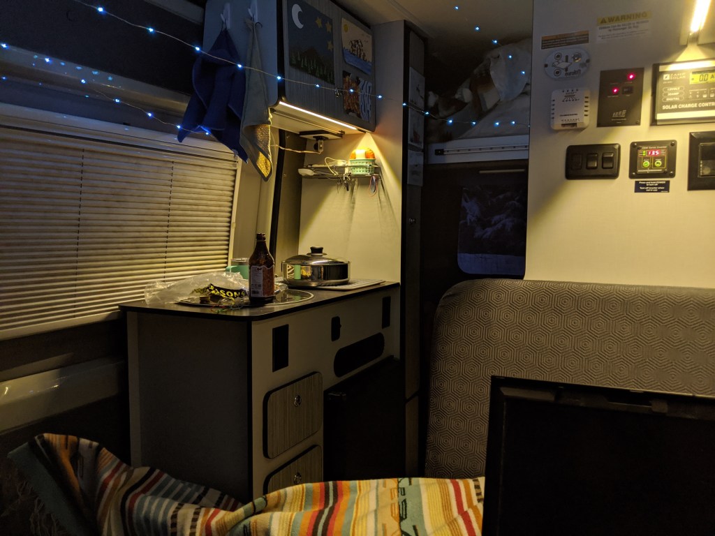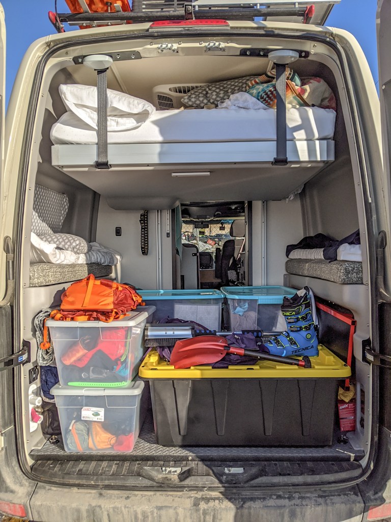 While in Bend at my parents’, we swapped out our bikes for skis, backpacking gear for snowshoeing gear, and shorts and tee shirts for long pants and flannel. Overall I think we have less stuff than before, or at least it is better organized. We added a soft bin between the front seats to hold all our many water bottles and car snacks (largely candy). We also added a similar bin to the back for the Instant Pot, cook set, and plastic bowls. Without the bikes we can keep the bed a bit lower so it is only slightly higher than intended (due to our bins – wish we had thought of our winter setup when we bought them). My mom and I (mostly my mom) added a mattress topper and made new sheets for the bed. The bed is in three parts – the main bed that goes up and down and small sections of mattress that stay in place in the bulb outs on the side of the van. This makes everything bed-related more complicated. All our skis are in the roofbox, which takes a little time given the ladder has to be relocated to the side of the van. Overall we are happy with the setup – especially some LED lights that we’ve lined the ceiling with to keep things more cheerful.