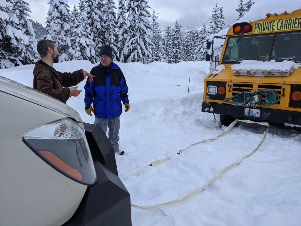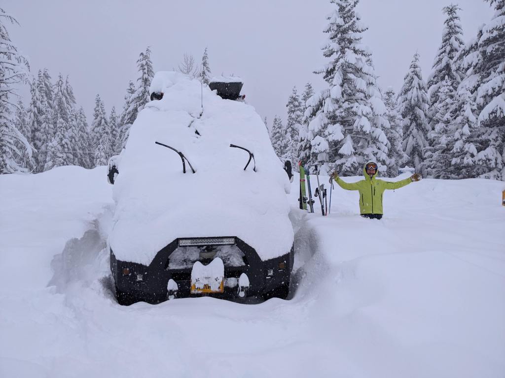 Snoqualmie – while we got a decent amount of snow at Crystal, we read that the real snow was happening at Snoqualmie so we made the couple hour drive for a few more days of Washington skiing. I couldn’t get over all the buried cars in the parking lot, wondering where their owners were. We stuck to the main part of the resort and I only got stuck in the deep powder once. However, the van got stuck in the snow several times when we tried to leave our parking spot in the lot we’d camped out in for a couple nights. A converted school bus was stuck and blocking one of the lot exits, and when the lot was plowed the other exit was blocked with snow. We manually cleared the area the snow plow had obstructed, but then got stuck in the soft snow several times. We got to put our recovery tracks to use, which were amazing at helping us get out of the snow. We then went back to try to help the bus now that we could access the front of it, but even the Gnar Wagon couldn’t pull it out. Luckily the ski resort sent a tractor to help them out as we were leaving.